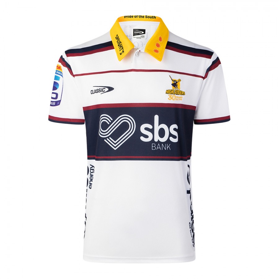 Show your pride on the road with the Highlanders Mens Away Rugby Shirt 2026. This striking white kit is a modern take on a classic Highlanders look, combining clean lines with bold Southern detailing. Featuring the iconic navy and maroon chest band, contrast yellow collar, and official 30-year Highlanders crest, this jersey honours the club’s legacy while delivering a fresh, contemporary edge. Engineered in lightweight, breathable performance fabric, it’s designed for comfort whether you’re backing the boys from the stands or wearing it day-to-day. Finished with official sponsor branding and premium construction, this is an authentic supporter jersey built for true Highlanders fans.